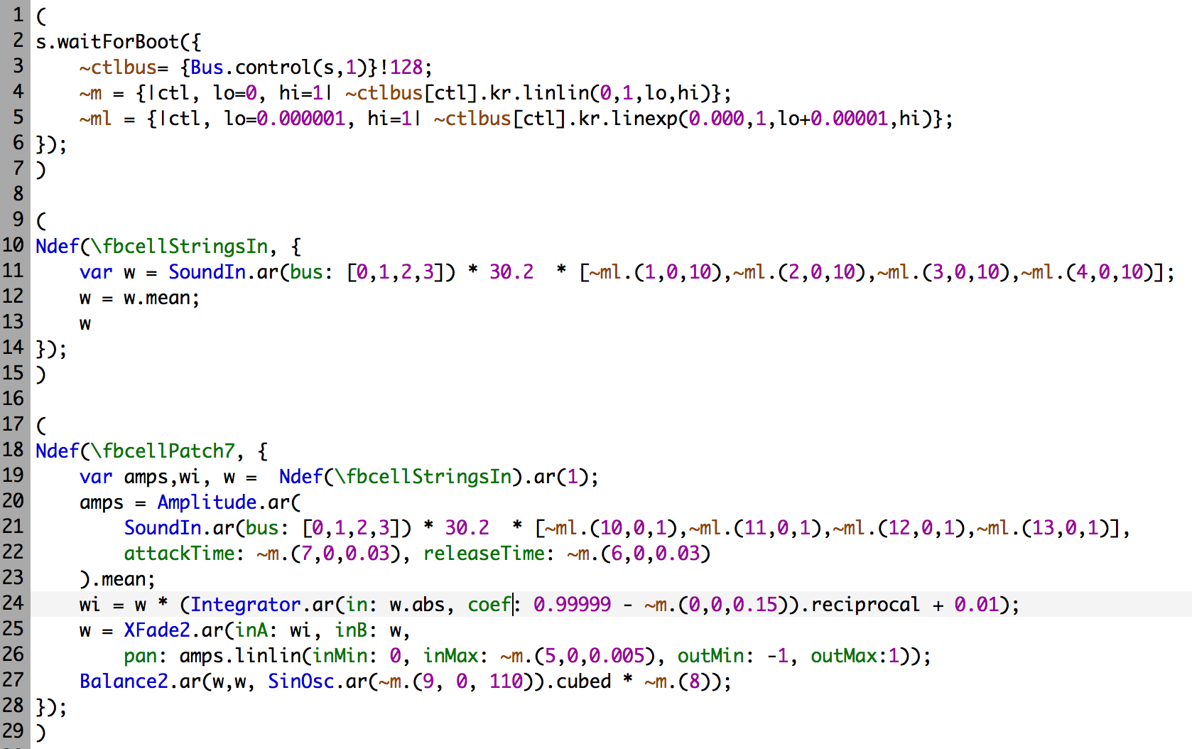 In the first section lines 2-5, functions are defined for reading the positions of the knobs on the control board. ~m maps the value into a linear range, and ~ml maps it into an exponential range.