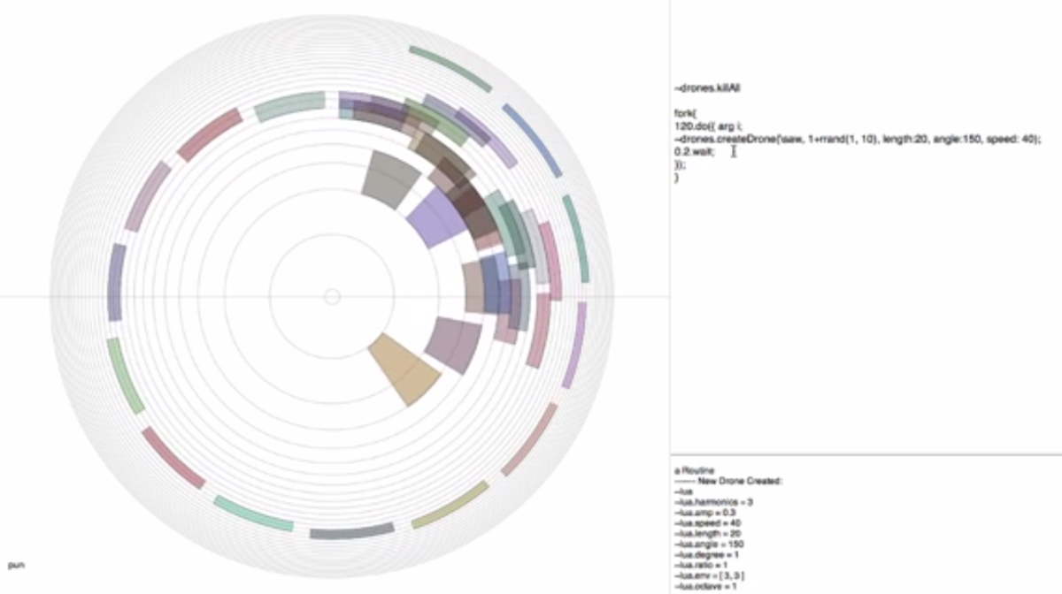 The Threnoscope is a spatialised drone instrument that is played using live coding. Drones are programmed to move around a circular path, and the instrument is typically diffused through four or more speakers. With 2FCT, we set up the Threnoscope so that in addition to a multichannel speaker setup, the two feedback cellos also received signals and became part of the diffusion system. This had some interesting effects in performance, where a feedback cello will become saturated by a drone as it passes through, changing the dynamics of the instrument. It links the instruments together into a larger shared instrument.