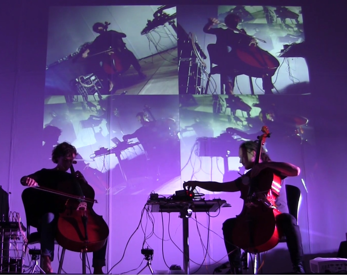 We experimented with various bits of hardware to influence the sounds of the cellos: clothes pegs, laser printer parts, screwdrivers. The pegs work well when placed on individual strings just above the bridge; as the strings vibrate, they vibrate themselves and react against the motion of the string. We both used contact mics at the start of the gig, which were connected directly into the transducers on the cellos. Playing the cellos with these is a bit like probing them with stethoscopes to find live points - felt like a cruder, sonic version of the analyses Hans Johansson carried out, to determine the nodes of oscillation on the instrument bodies.